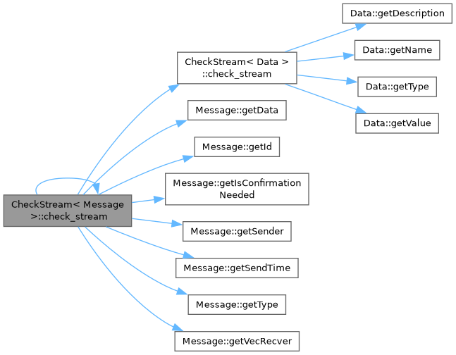 References CheckStream< Data >::check_stream(), check_stream(), Message::getData(), Message::getId(), Message::getIsConfirmationNeeded(), Message::getSender(), Message::getSendTime(), Message::getType(), and Message::getVecRecver().